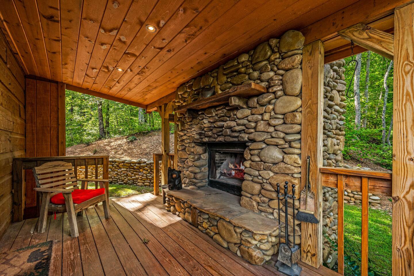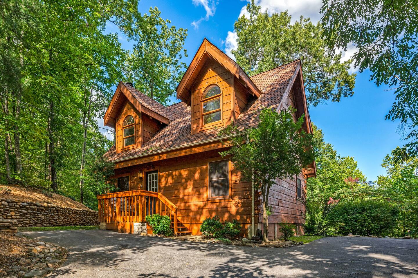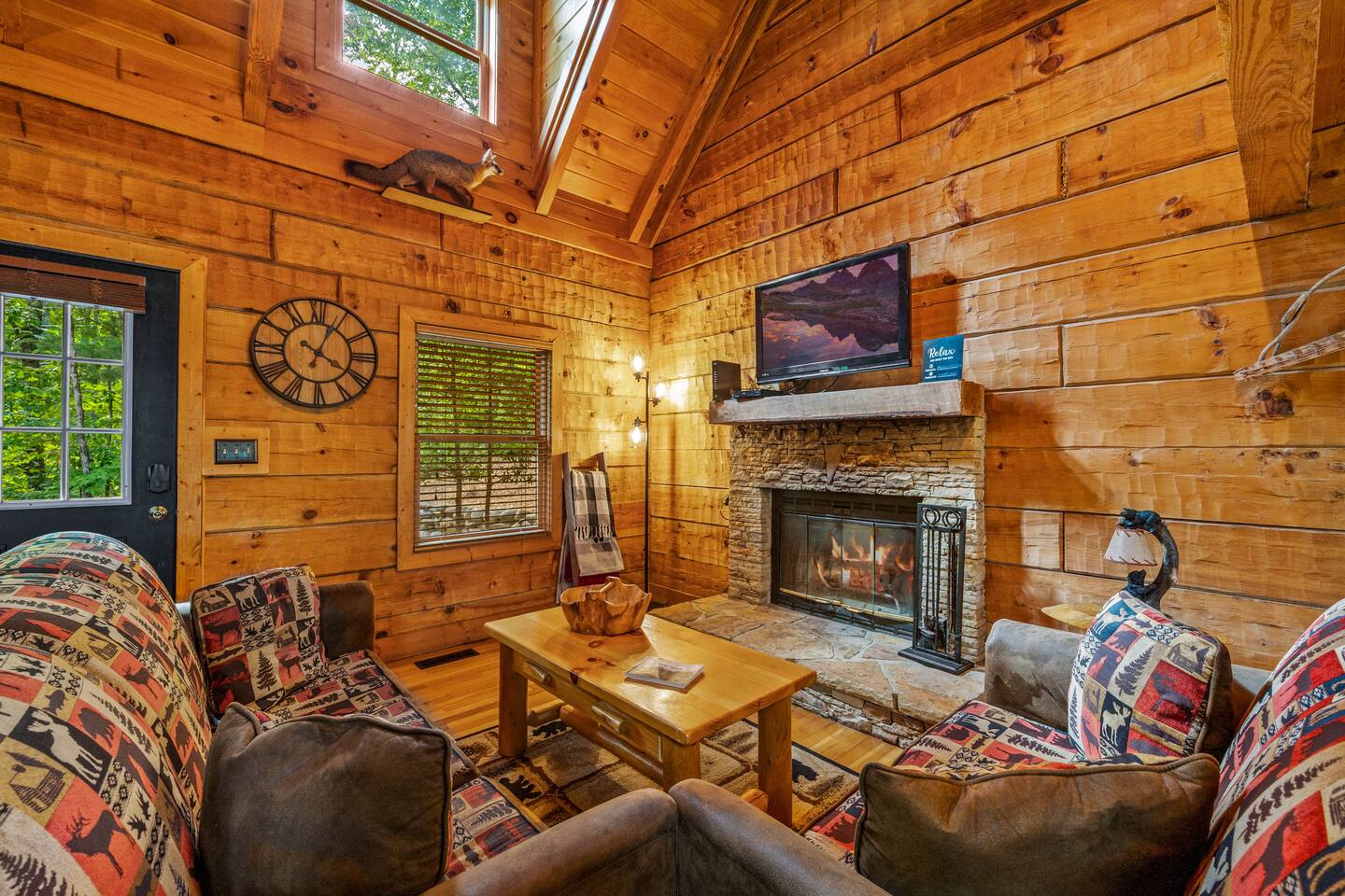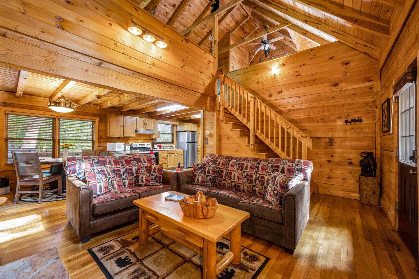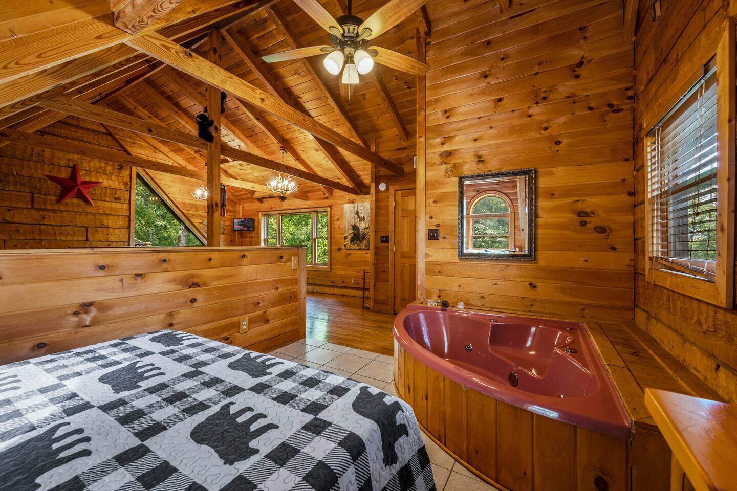 Welcome to "Moonlight Ridge", a unique real log cabin with indoor and outdoor wood fireplaces! Enjoy the mountain views from the hot tub or soak in the jacuzzi tub. This beautiful mountain retreat sleeps up to 6 (King bed on the main floor, Queen bed in the open loft, and Queen sleeper sofa)! Soaring ceilings and plenty of natural light will make you feel right at home while you relax by a crackling fire inside or outside. Enjoy seclusion in nature but also quick access to downtown Gatlinburg, Pigeon Forge, and Great Smoky Mountain National Park! As soon as you walk into the front door you are greeted by the natural warmth of the all wood interior and the abundance of natural light spilling through the windows. Relax on the couch or take in the view of the mountains from the private deck. Cook up a delicious feast in the updated kitchen or on the charcoal grill. Take a dip in the hot tub on the deck or soak in the jacuzzi tub and warm up by one or both of the real wood burning fireplaces; a rarity these days! This cabin is private enough to enjoy peace and quiet, see the stars, and the moon, but close enough to get to your favorite attractions quickly. For Pickleball lovers there are two community use courts with equipment rental available at the security office. During the hot summer months enjoy the three included community pools, including the newest salt water heated pool right around the corner, to cool off after a day of fun! (seasonal availability Memorial Day to Labor Day) Gatlinburg, Pigeon Forge, The Arts and Crafts District, and the Great Smoky Mountains National Park are all within 15 to 30 minute scenic drives. There are also plenty of places to eat, drink, and shop at along the way! Charcoal and firewood are not provided but there are plenty of local vendors nearby. Life happens and we highly recommend purchasing travel insurance in case you would need to cancel your trip outside of the free cancelation window. The booking platform offers travel insurance at checkout or you are welcome to choose your own! This cabin is located in the mountains. There are somewhat steep roads to access the property but any vehicle should be able to drive them without issue. In the event of winter weather, four wheel drive or all wheel drive is required. Occasionally weather and other natural events will limit access to and from the cabin, interrupt power, internet, cable TV, or other services outside of our control. These occurrences are not cause for a refund. The hosts are not on site but are available via messaging through the platform from 9AM to 6PM Eastern Standard time or 24 hours if an emergency arises. There is one security camera facing the front of the house and driveway. .