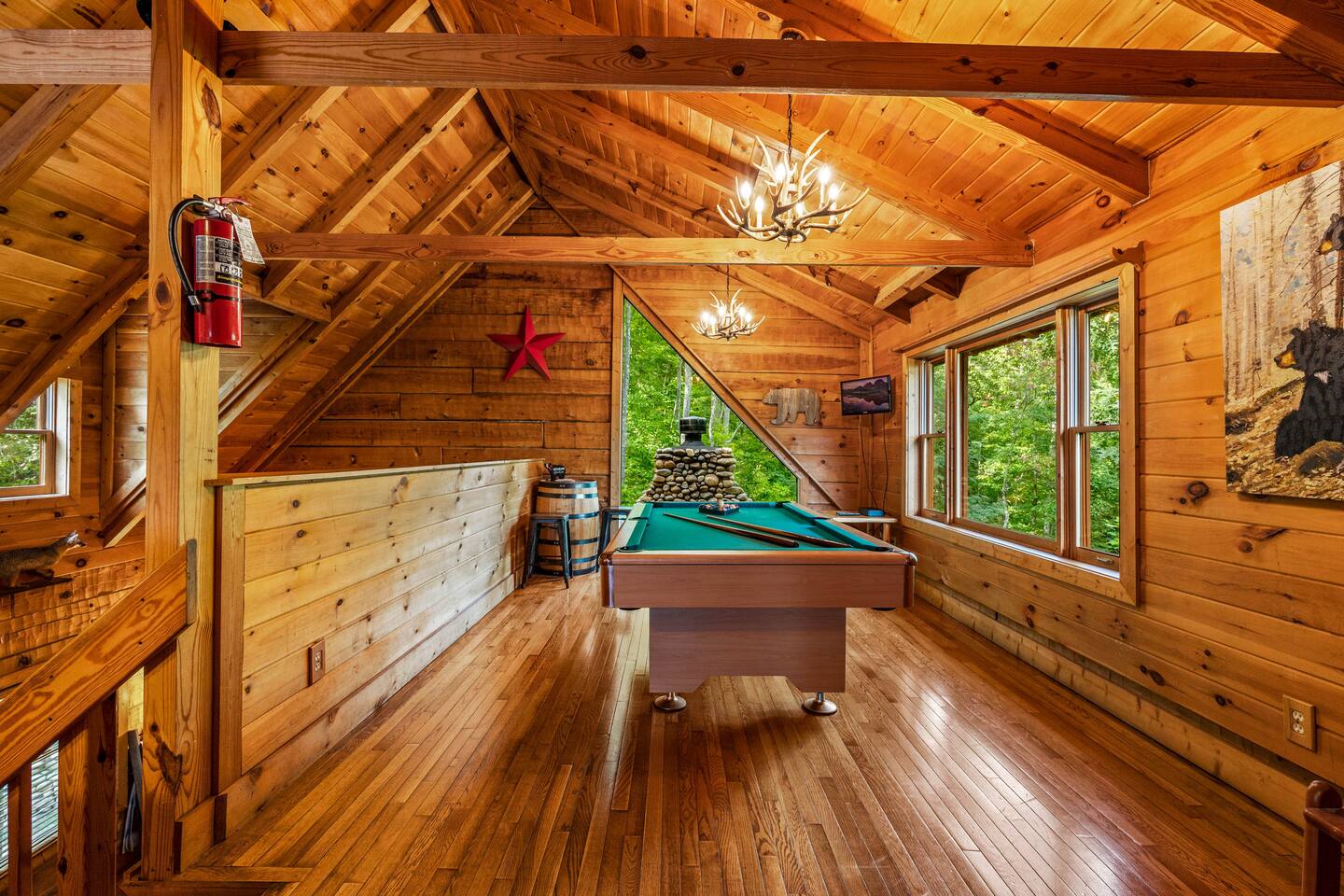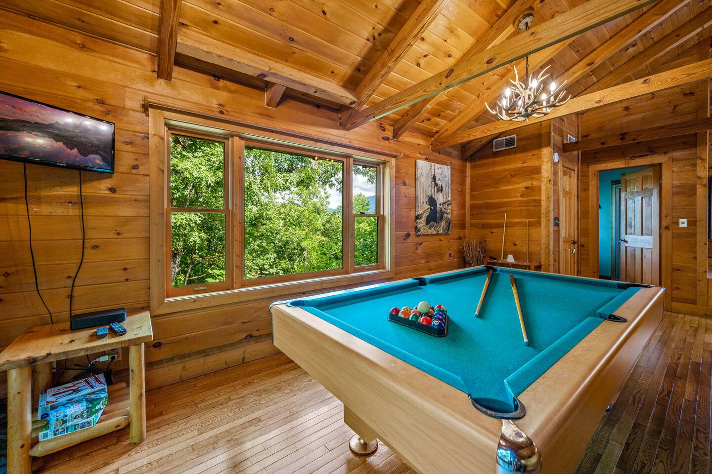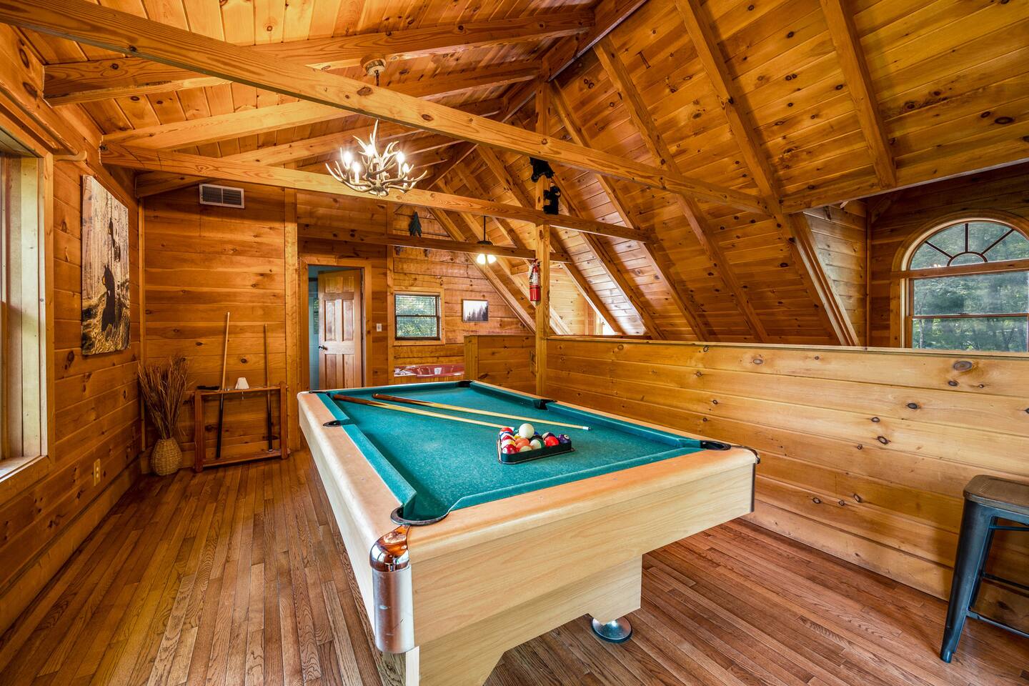 ✔Real log Cabin tucked into the mountains! ✔King bed on first floor! ✔Queen bed in airy loft with exposed beam cathedral ceilings! ✔Covered outdoor wood burning stone fireplace ✔Hot tub with mountain views as well as indoor Jacuzzi! ✔Pool table! ✔Indoor wood burning fireplace! ✔High speed cable internet ✔YouTube TV and Roku TVs for streaming! ✔3 community pools ✔Community Pickleball court! ✔13 miles to Gatlinburg/19 miles to Pigeon Forge