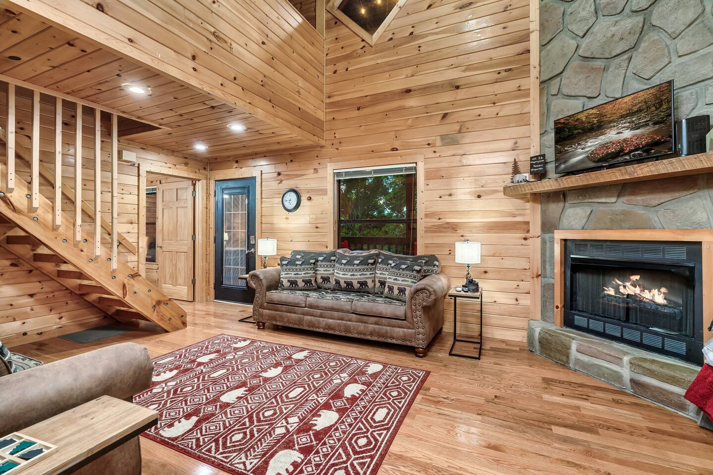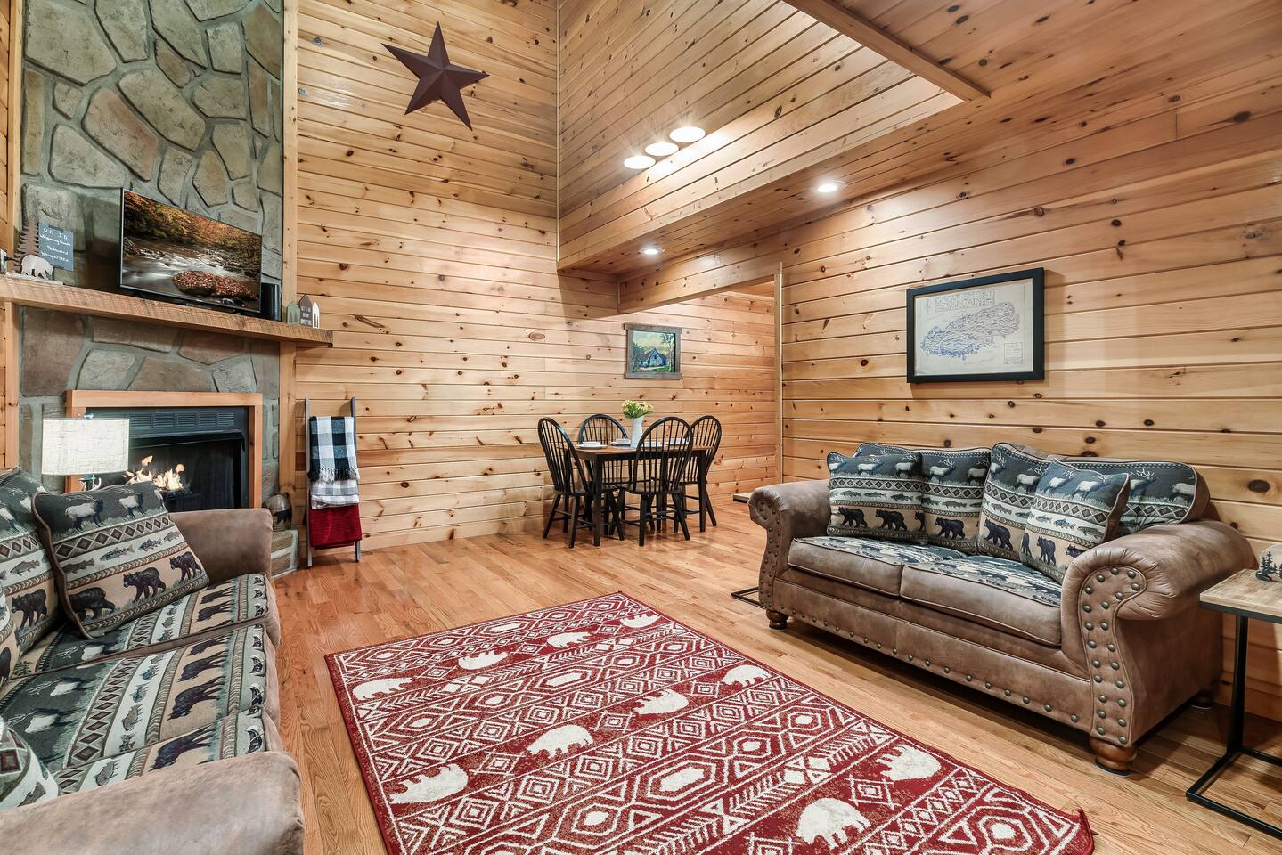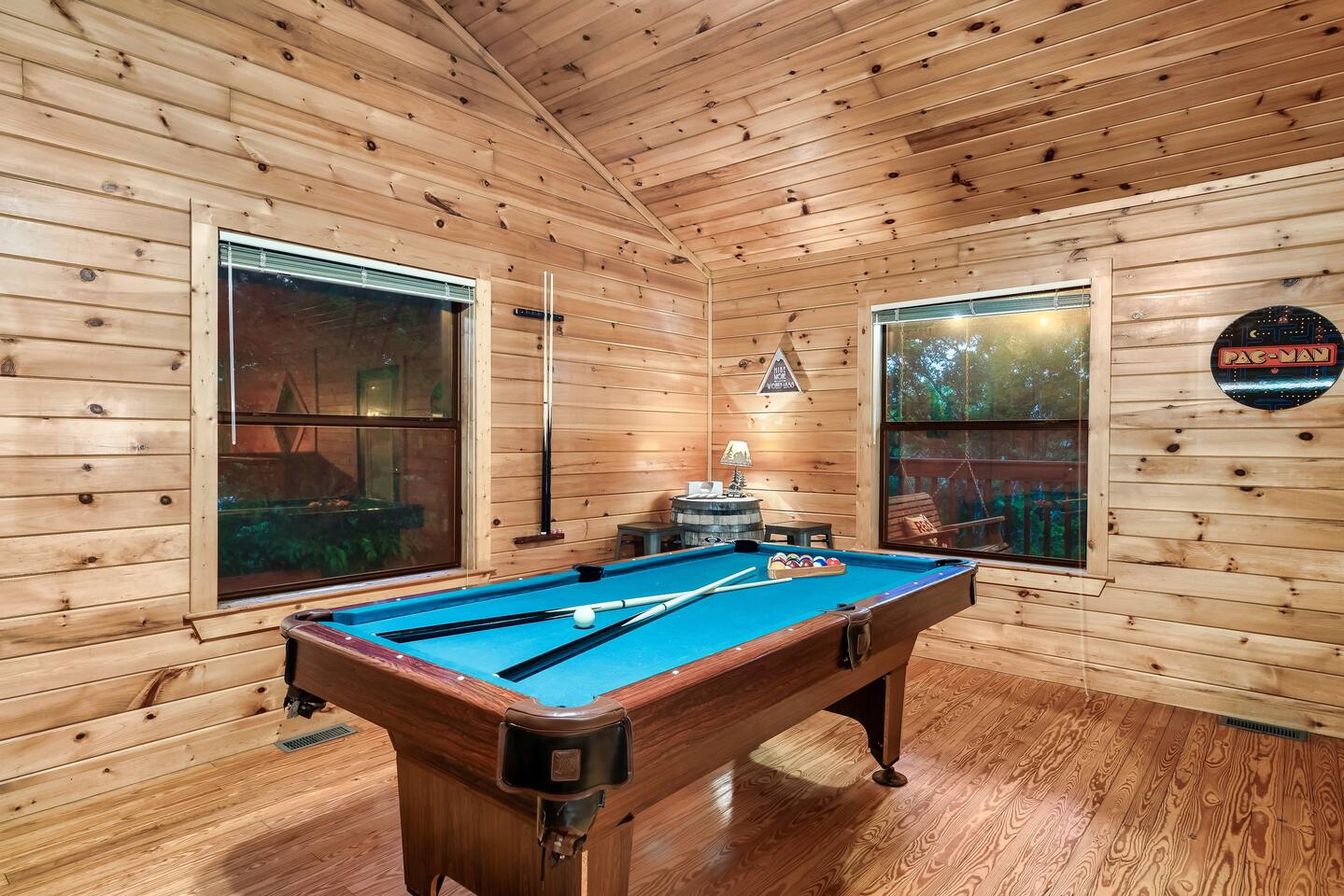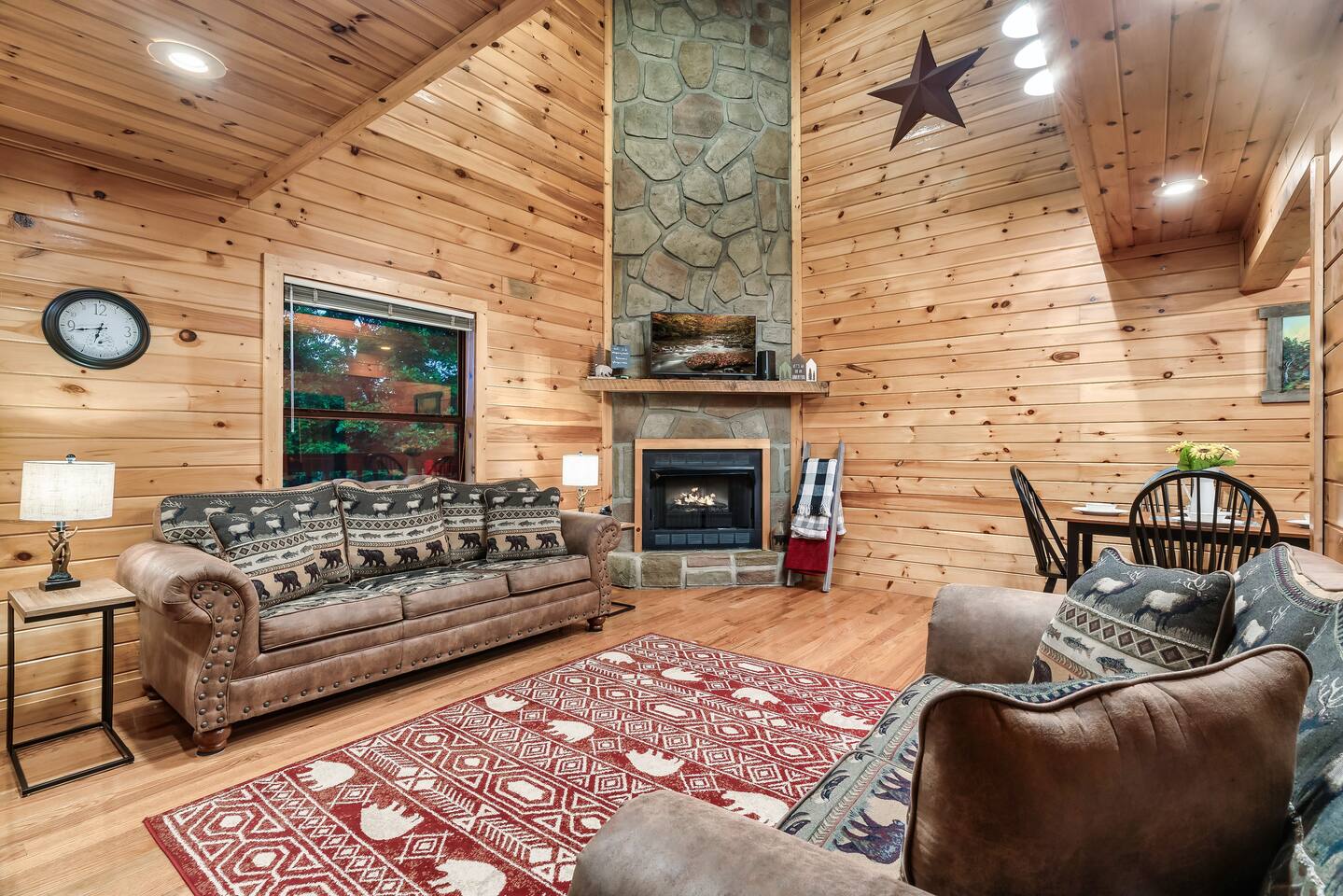 ✔Dog Friendly! (Max 2, 80lbs each, $100 pet fee) ✔Secluded cabin tucked into the trees! ✔King bed 1st floor suite with whirlpool tub! ✔Private and secure second floor hot tub! ✔YouTube TV and Roku TVs for streaming! ✔Level, covered parking for 2 or more vehicles! ✔Easy to use, realistic electric fireplace! ✔Game room with pool table and stand up arcade game with 12 classic games! ✔Treetop views from double decks! ✔9 miles to Gatlinburg and Pigeon Forge city centers. ✔High speed internet!